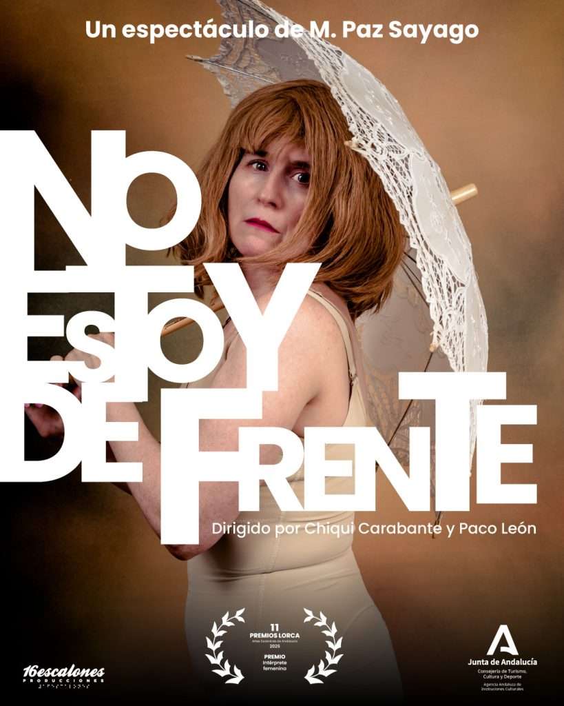 Después de una larga y reconocida carrera como actriz en diversas compañías de teatro, en cine y en televisión, NO ESTOY DE FRENTE es la primera producción de Mari Paz Sayago como compañía. Escrita por ella misma y Chiqui Carabante y acompañada por excelente equipo artístico con nombres como Paco León, Guillermo Weickert, Maria Cabeza de Vaca.